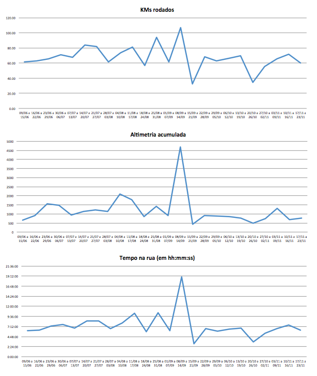 Com viagens na segunda, sexta e sábado, consegui apenas espremer 4 corridas. Compensei aumentando a distância – mas os caminhos que escolhi, incluindo uma trilha súbita lá em Joinville e outra urbana, hoje cedo, aqui em Sampa, não privilegiaram pace. Meu treinador provavelmente brigará comigo, mas não me arrependo.