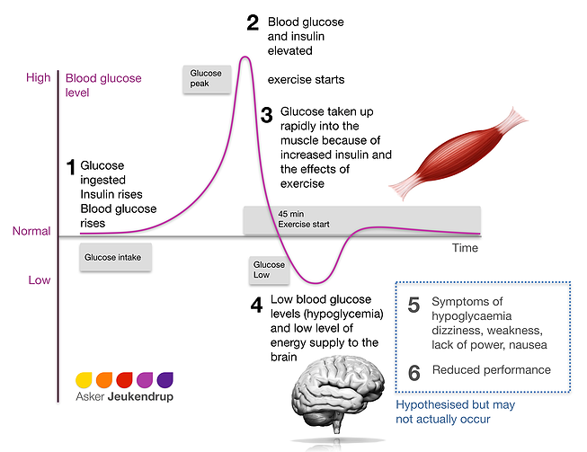 Na semana passada eu me deparei com um gráfico BEM interessante, publicado no MySportScience, que ilustra o efeito da ingestão de alimentos. A explicação é simples: comer antes de treinar gera um pico de glicose e, consequentemente, de insulina. A glicose alimenta a musculatura e acelera a performance mas, depois de algum tempo (cerca de 45 minutos), o seu efeito termina e o organismo entra em uma espécie de “vale”, pedindo mais alimentação para se manter no estado em que estava.