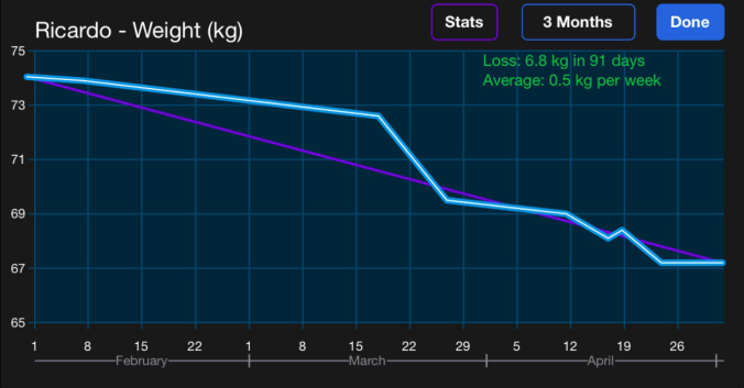 - O problema é que, quando se muda um hábito alimentar, qualquer coisa diferente parece forçação de barra. Tenho quase me cobrado diariamente a comer mais carbs para não emagrecer tanto. Ainda assim, veja os resultados no gráfico abaixo: ele mostra 3 meses (sendo o primeiro fora do low-carb e os últimos dois dentro). Em 60 dias, despenquei de 75 para 67kg.