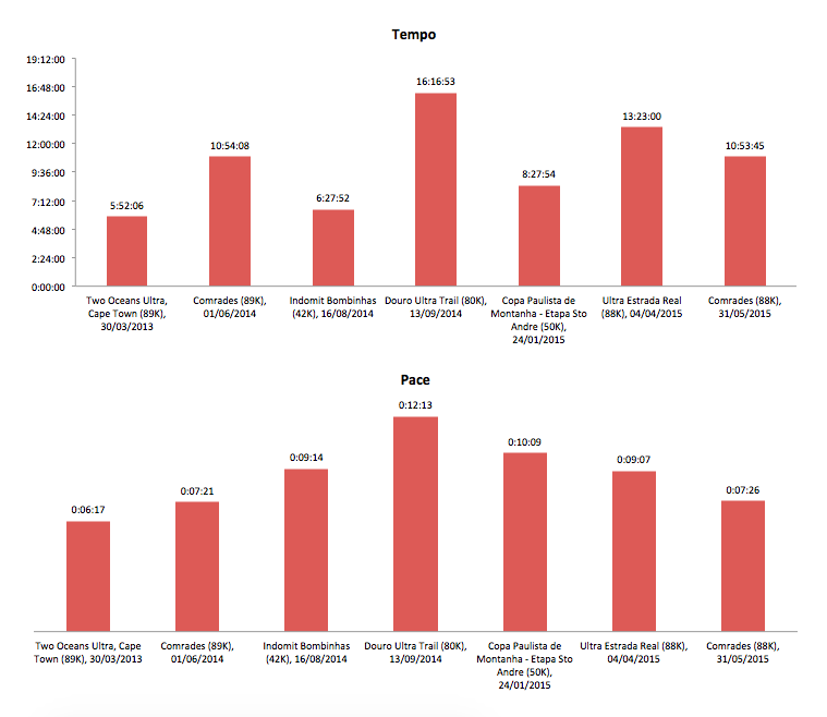 É difícil comparar uma ultra com a outra: cada uma delas tem terreno e distância diferente, o que as faz únicas. Mas dá para perceber que me mantive com uma resistência semelhante dado que a diferença das minhas duas Comrades ficou em ridículos 23 segundos (mesmo considerando a alternância dos percursos).