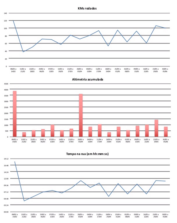 Estou na segunda semana e, apesar de uma leve baixa em relação à semana passada, dá para considerar que consegui resultados melhores. No total, fiz 107K na emana passada e 100K nesta, ambas com uma maratona em cada sábado.