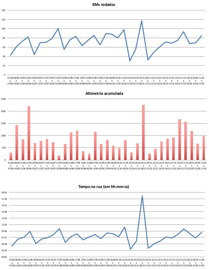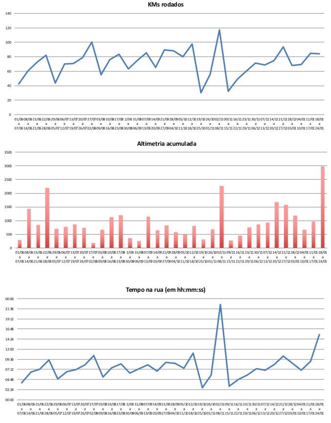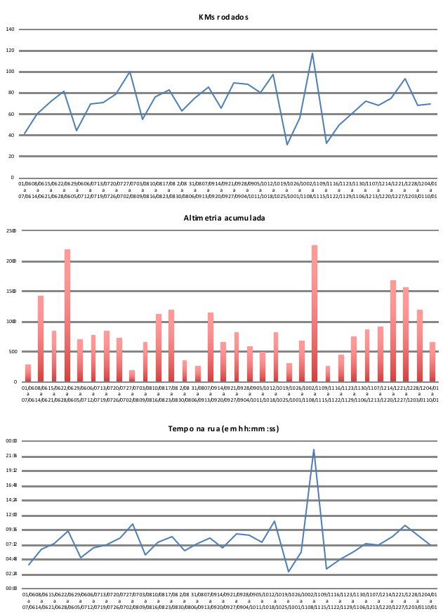 Na semana retrasada, 85Kms também comprimidos – desta vez em quatro saídas. Subi o que pude aqui em Sampa, somando algo como 1.000 metros de altimetria acumulada, mantendo um pace mais lento porém controlado.