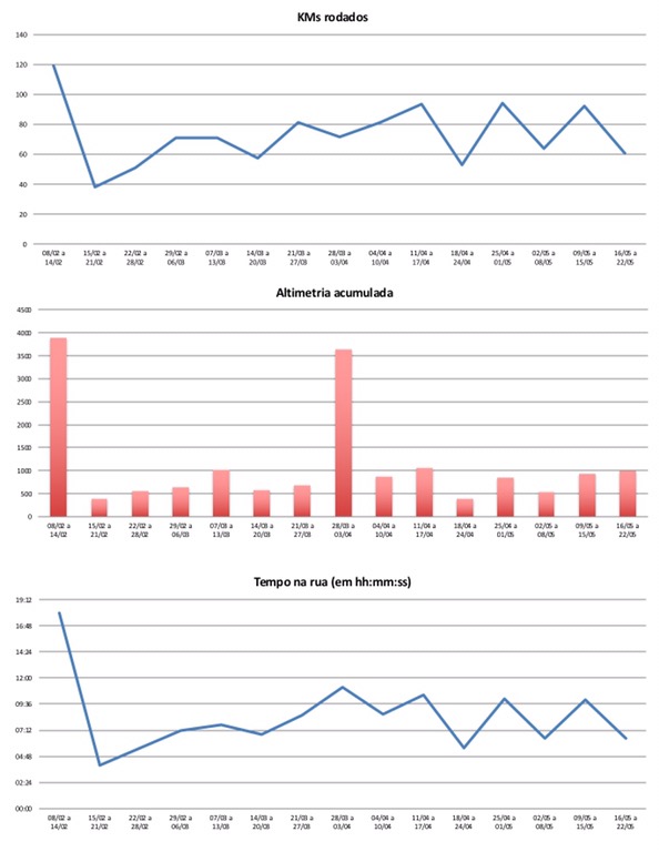 Até agora, estou como que em fase de adaptação a esse modelo de treino de 3 semanas pesadas e uma leve, ampliando a volumetria apenas em blocos mensais. Fato: a resistência está mesmo maior: fazia tempo que não somava semanas acima dos 90K, incluindo longões em pares de 40K aos sábados e 20K aos domingos.