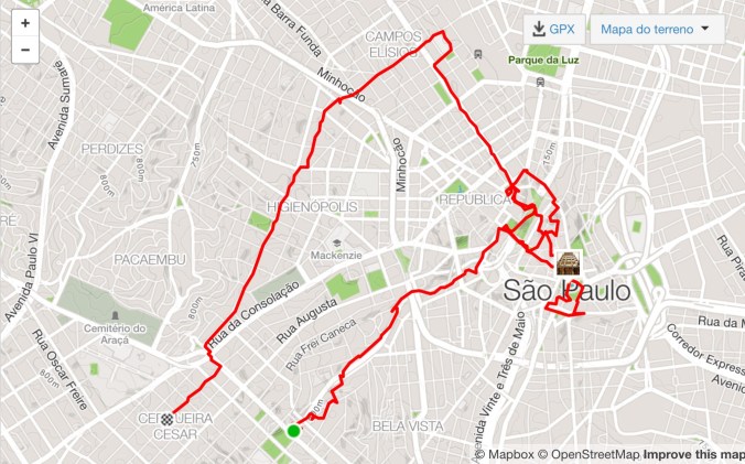 Desta vez, no entanto, uni a vontade à curiosidade histórica: tracei uma rota que saiu do MASP, e cruzando a 9 de Julho, chegou no Obelisco de Piques. Explico: ontem, 25 de janeiro, foi aniversário de São Paulo – e esse obelisco é considerado o primeiro monumento inútil de São Paulo. A importância disso?