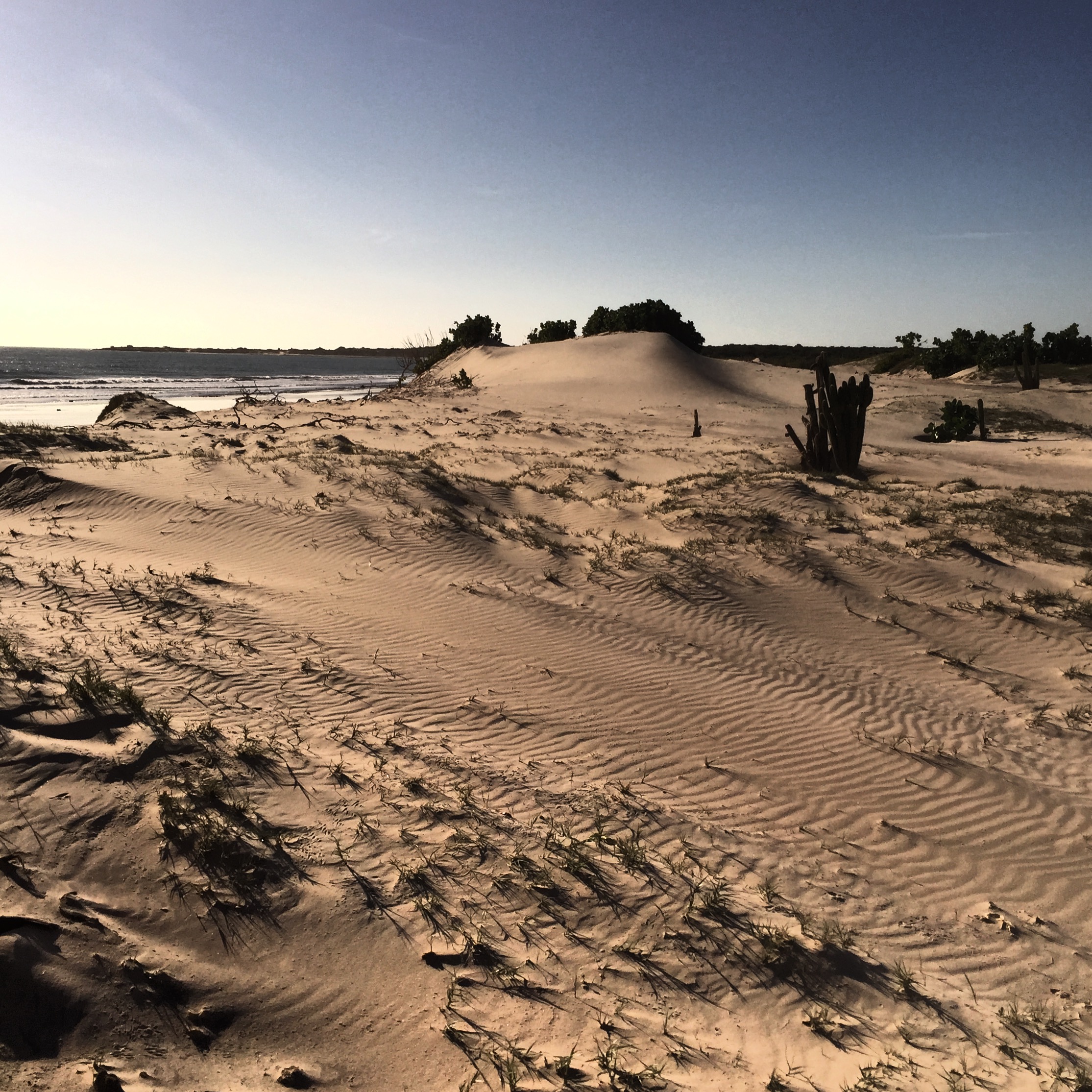 Primeiro, saí ainda cedo e com maré começando a baixar pelo trecho oeste. Repeti o caminho de ante-ontem, absolutamente deserto e na companhia apenas de mar e dunas. Decidi variar e, por pura diversão, troquei trechos de areia dura por mais e mais dunas, escalando-as e correndo para baixo como se tivesse 10 anos de idade. Fiz isso uma, duas, três, várias vezes. Até que os Vibrams, que me acompanharam em toda a viagem, ficassem tão cheios de areia que seria necessário parar para recalçá-los.